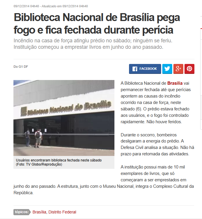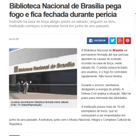 • Biblioteca Nacional de Brasília pega fogo e fica fechada durante perícia